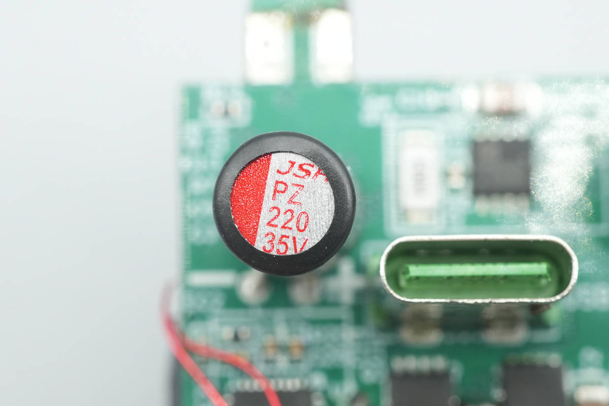 另一颗输出滤波固态电容也是来自万京源,规格为25V220μF。