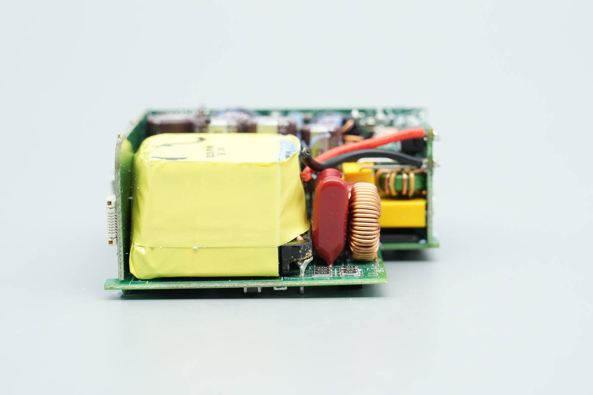 PCBA模块两侧以及输出端均焊接有小板,中心区域设有高压滤波电解电容、主控『芯片』供电电容、输出滤波电容等器件。