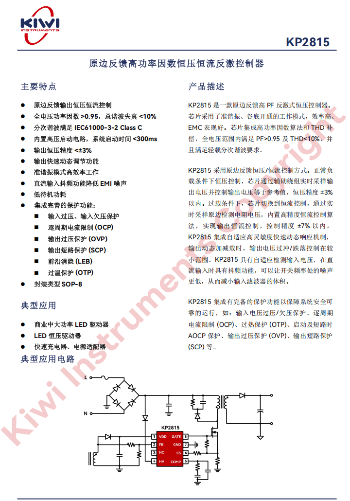 KP2815集成有完备的保护功能以保障系统安全可靠的运行,如:输入电压过压/欠压保护、逐周期电流限制 (OCP)、过热保护 (OTP)、启动及短路时AOCP保护、输出过压保护 (OVP)、输出短路保护 (SCP) 等。