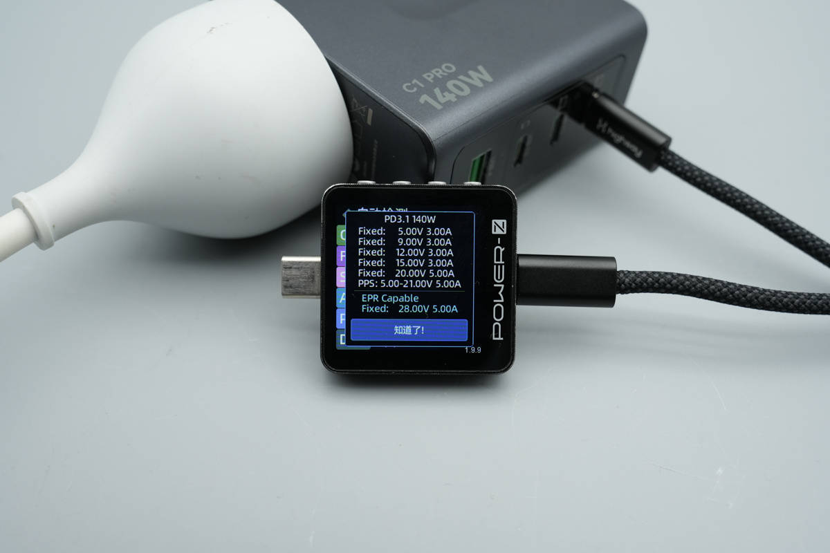 PDO报文显示USB-C1口还具备5V3A、9V3A、12V3A、15V3A、20V5A、28V5A六组固定电压档位,以及5-21V5A一组PPS电压档位。