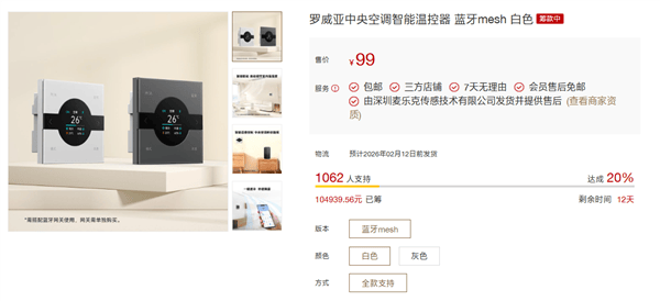 快科技12月31日消息,小米有品上线了一款“罗威亚中央空调智能温控器 蓝牙mesh”,目前已经开启众筹,定价99元,有白色款和灰色款可选。