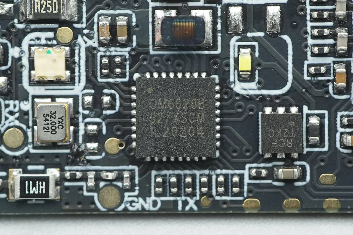 蓝牙『芯片』来自OnMicro昂瑞微,型号OM6626B,这是一款BLE&2.4G双模SOC,支持蓝牙5.4协议并向下兼容,支持64MHz主频Cortex-M4核,存储资源包含1MB Flash以及80KB SRAM。