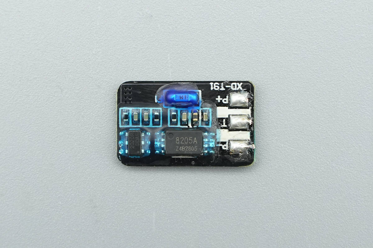 锂电保护小板正面设有锂电保护『芯片』、锂电保护管、保险丝等器件,并且打胶水保护。