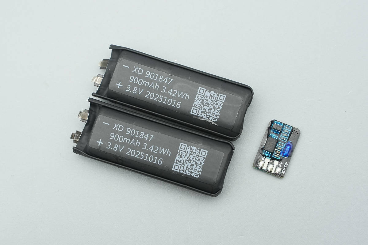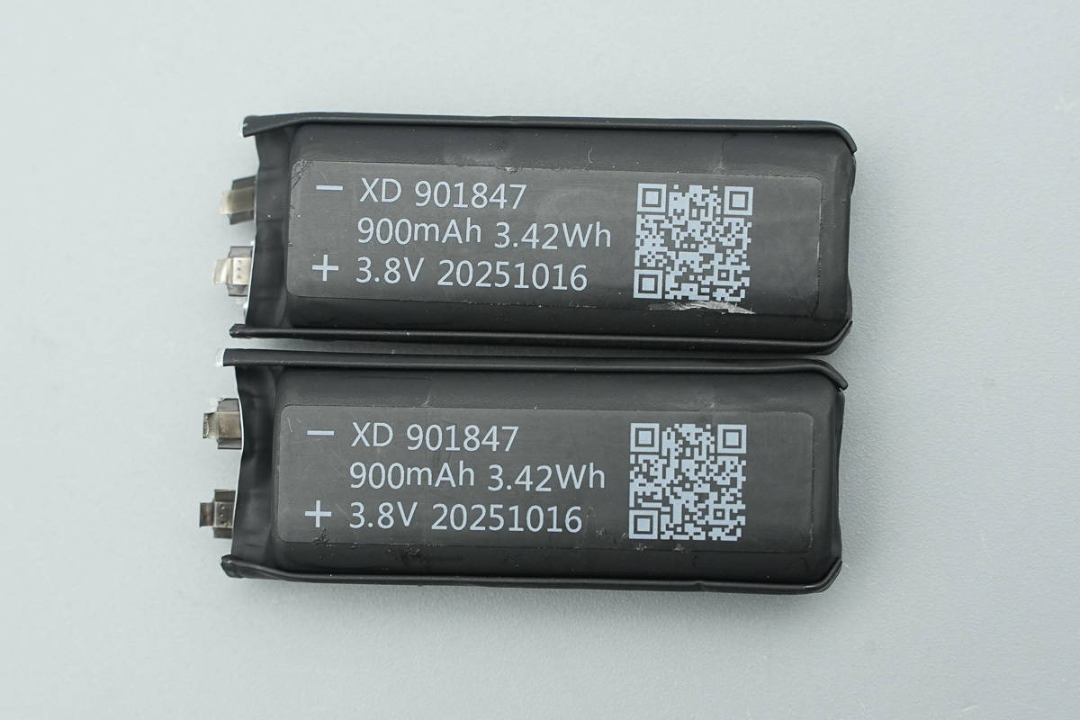两块电芯料号完全一样,型号XD 901847,规格为900mAh/3.42Wh/3.8V,生产日期为2025年10月16日。