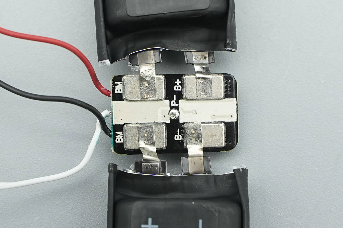 电池包由两块聚合物电芯组成,并设有锂电保护小板,电芯极耳之间填充泡棉。