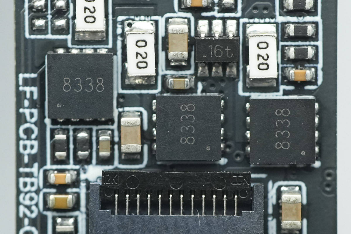三颗用于驱动伺服电机的MOS管来自上海晶岳,丝印8338,实际型号为SSC8338GQ4,这是一款非对称双NMOS管,耐压30V,导阻9mΩ,采用DFN3*3封装。