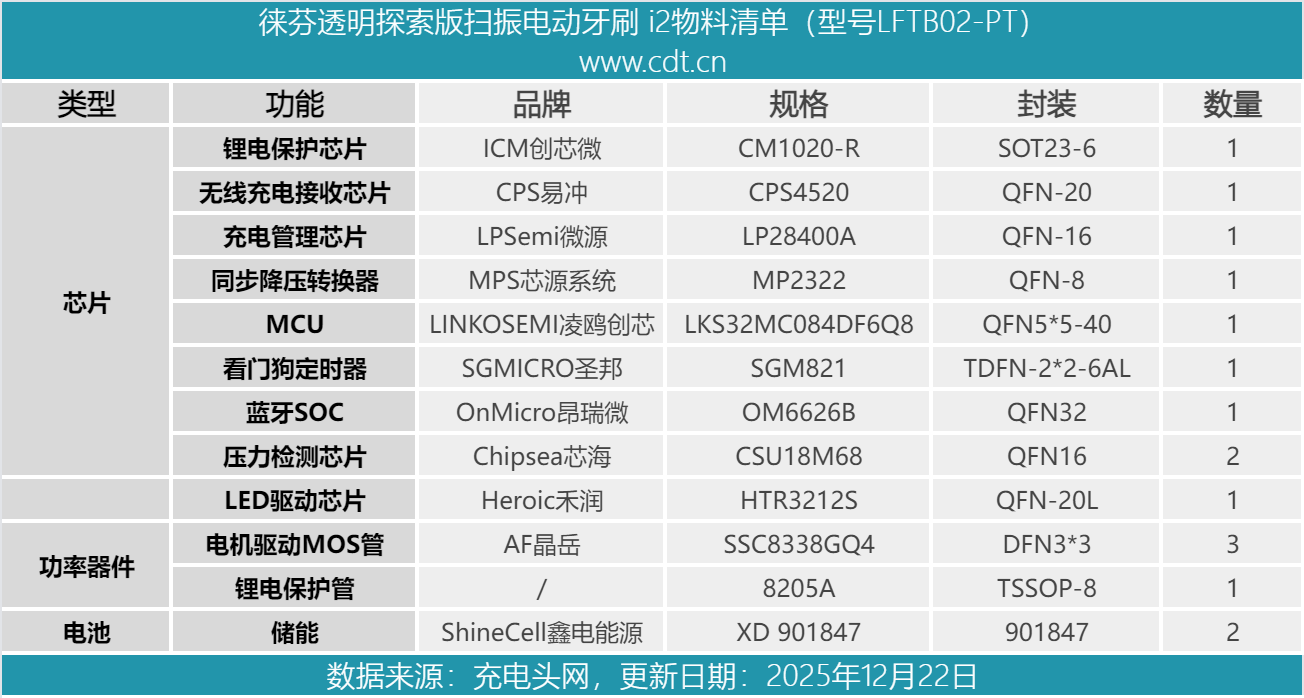 最后附上徕芬扫振电动牙刷 i2的核心器件清单,方便大家查阅。