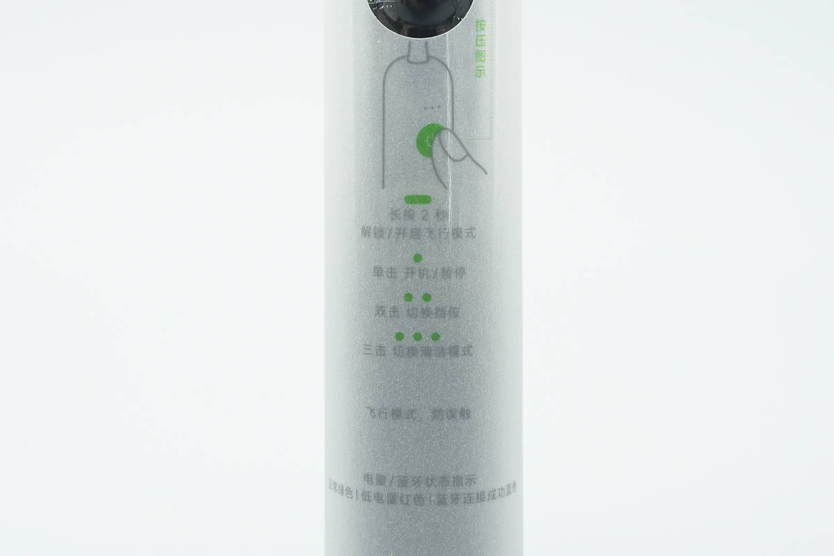 徕芬扫振电动牙刷 i2手柄初始状态下包裹一层防刮保护纸,顶部输出轴套有塑料壳保护。