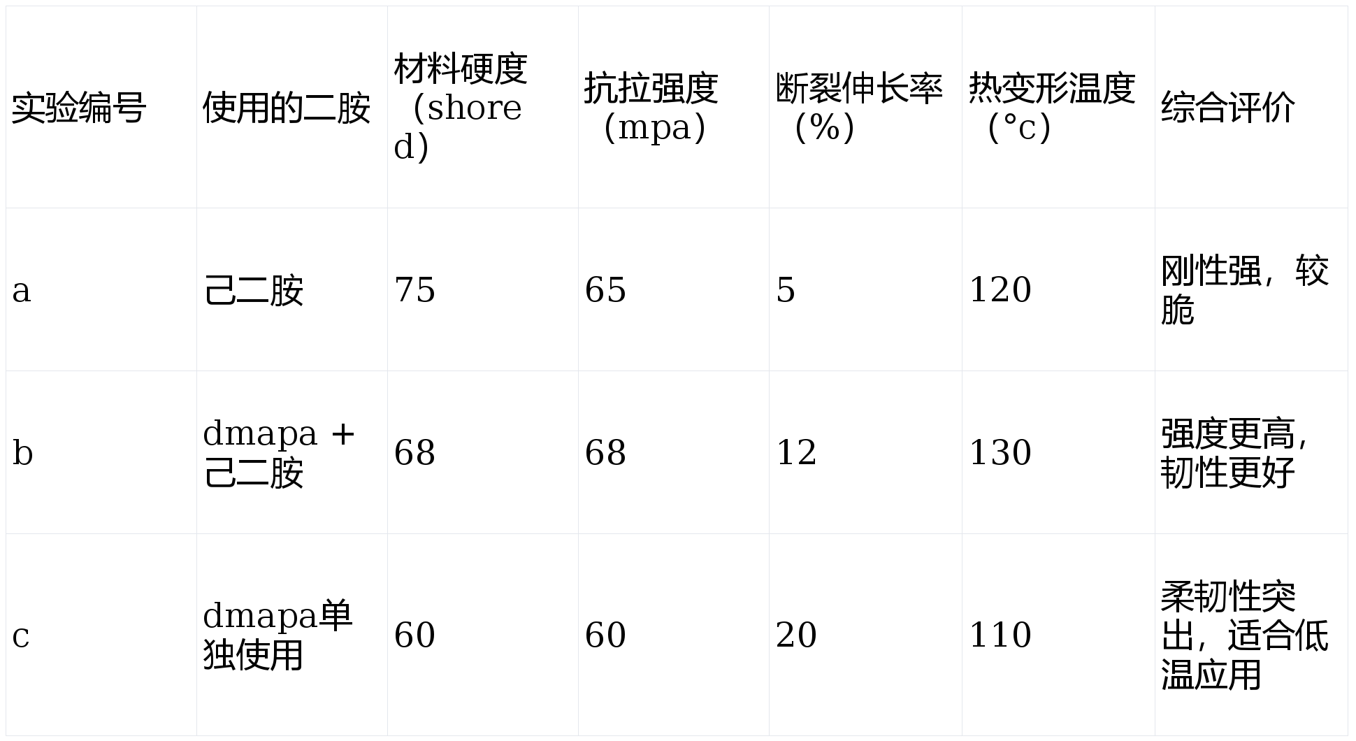 从上表可以看出,加入dmapa后,虽然硬度略有下降,但抗拉强度和断裂伸长率明显提高,说明材料的综合力学性能得到了优化。同时,热变形温度也有所上升,说明其耐热性能也增强了。