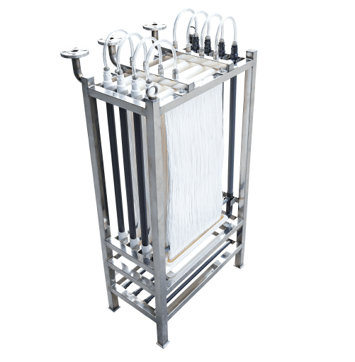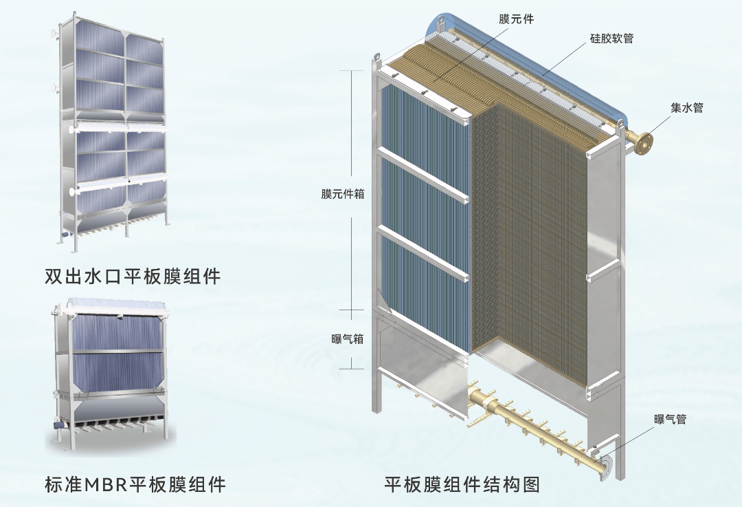 - 高抗污染浸没式MBR平板膜组件:分为单出水口膜组件和双出水口膜组件两种类型,可根据客户需求调整膜元件数量。检修时仅需更换损坏的膜元件,操作便捷,无需将膜池全部抽空后整组替换。