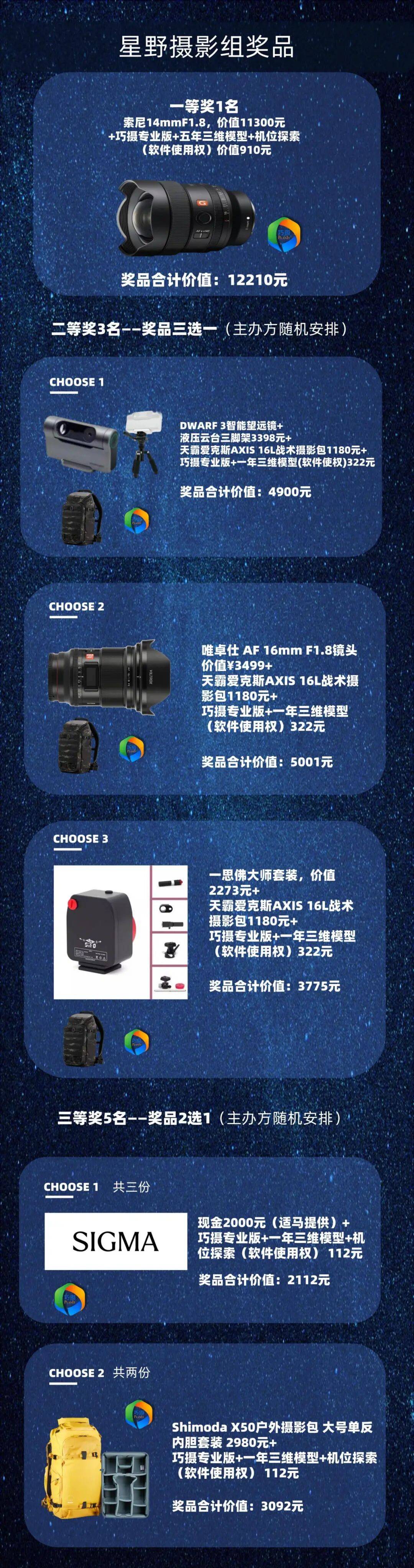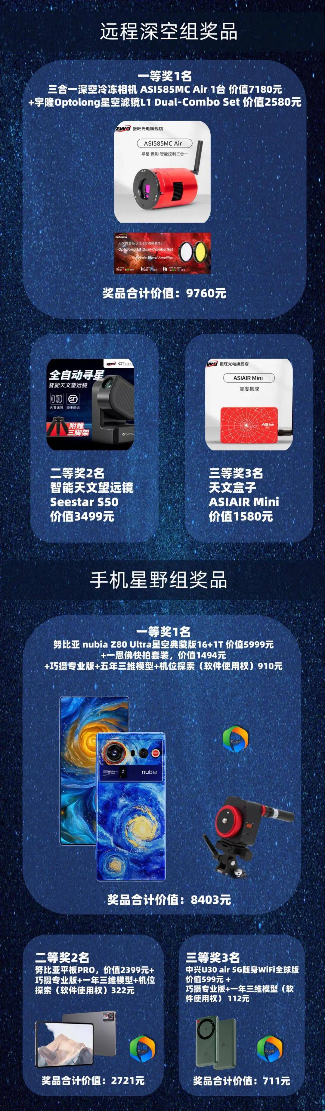 行星与日月、深空与彗星、星野、手机摄影、远程深空、星空视频共6组,按拍摄技法划分,满足不同摄影方向与层次的需求。你可以聚焦于月球表面的坑洼,记录行星的独特纹理;也能够将镜头对准遥远的深空,捕捉星云那梦幻般的色彩与形状;或是以广袤大地为前景,拍摄繁星点点的壮美星野;还能发挥创意,打造独一无二的创意星空作品;即便是用手机,也能参与其中,记录下你眼中的星空之美。