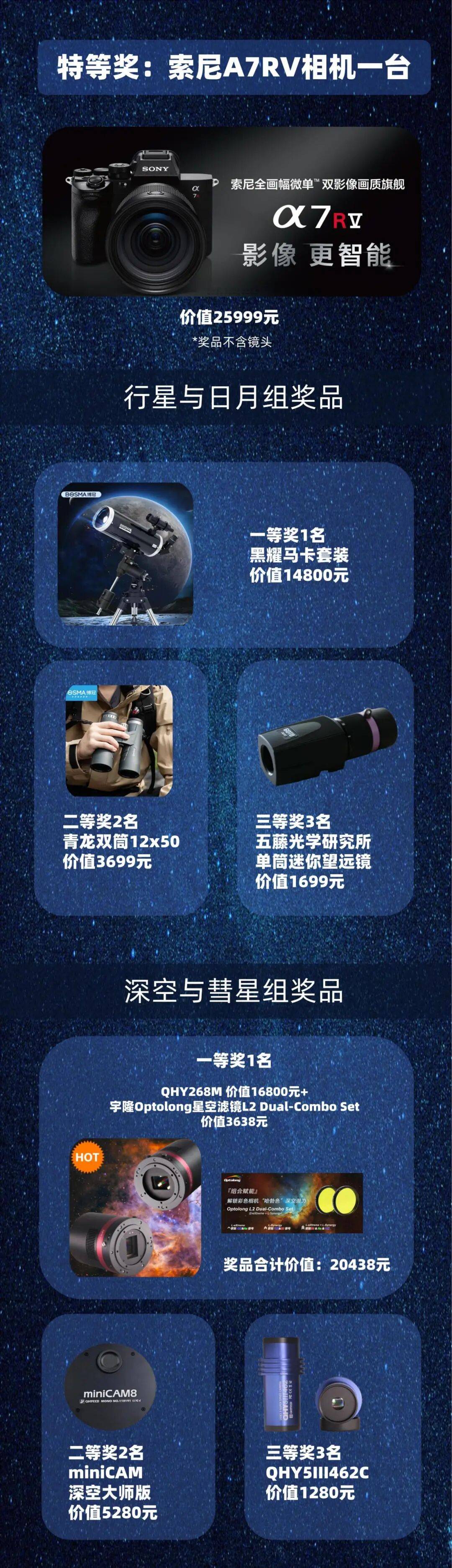 5.行星与日月(可投组图,组图按一张计算)、深空与彗星组、星野组、远程深空组、星空视频提交作品要求为JPG或PNG图像,文件大小最大不超过20MB,最大单边像素不超过1亿。