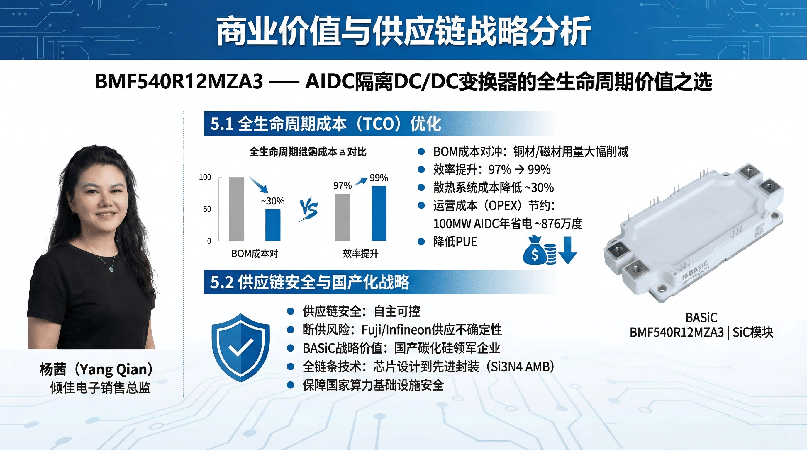 - 商业层面:尽管器件单价较高,但SiC方案通过节省被动元件成本、降低散热需求和节约长期电费,具备更优的TCO。