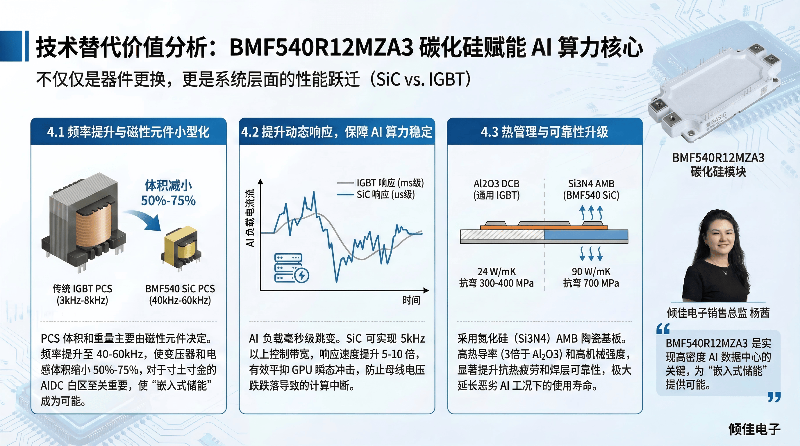 - 现状:使用IGBT的PCS通常工作在3kHz-8kHz,导致变压器体积庞大,难以塞入高密度的AI机柜。