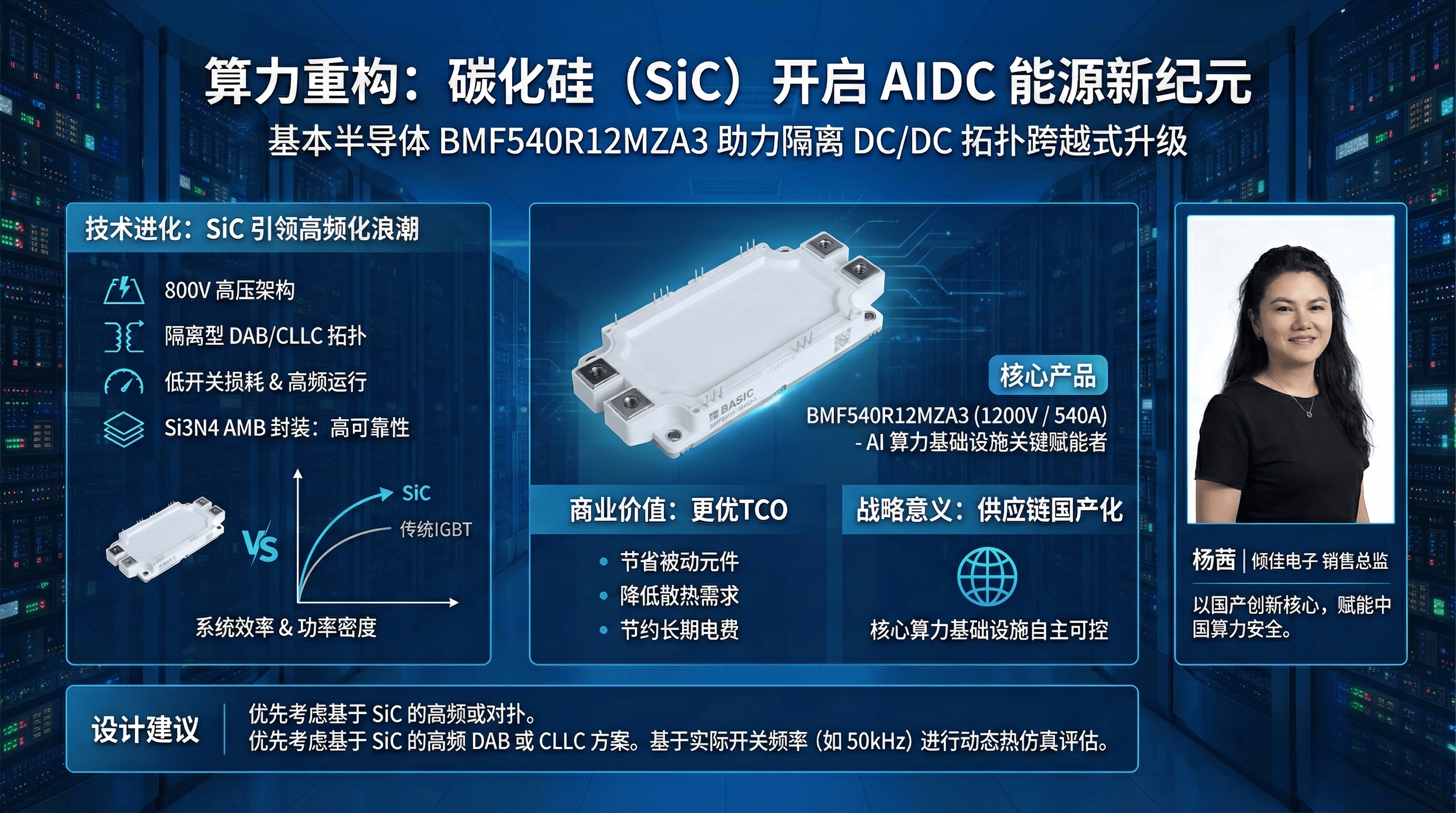 建议:PCS设计人员在进行AIDC储能系统开发时,应优先考虑基于SiC的高频DAB或CLLC方案。在选型时,不应仅对比器件的标称额定电流,而应基于实际开关频率(如50kHz)下的动态热仿真进行评估。BMF540R12MZA3不仅是一个合格的替代品,更是一个能够释放下一代AI『数据中心』能源潜力的升级选项。