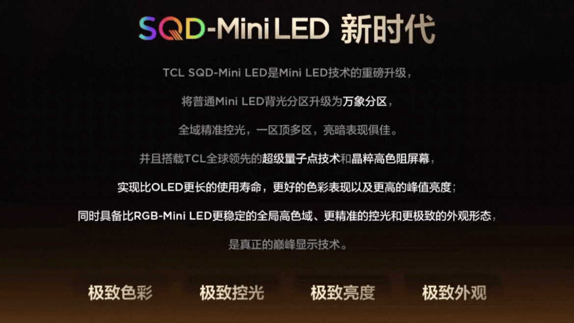 可难道就没有一种技术,能既亮又准又稳,把这场“妥协”终结掉吗?还别说,真有!而且我觉得LG这波操作,反而把这项真正的“黑科技”给推到了台前。那就是——TCL的SQD-Mini LED技术。