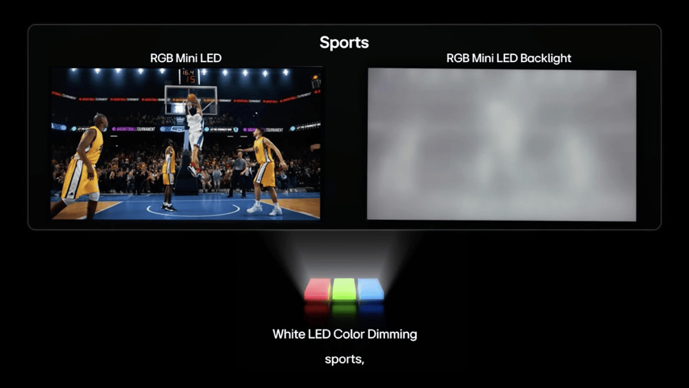 首先LG的第一波攻击,就对准了RGB-Mini LED最引以为傲的色彩表现。视频里直接揭短:在复杂色彩画面下,RGB-Mini LED竟然需要“退回白光模式”。这里给不懂的朋友科普一下,RGB-Mini LED的原理是用红绿蓝三色灯珠来混光,理想状态下确实能实现优质色彩。但现实很骨感,当画面出现高亮、色彩极其丰富的场景时,三色背光在混光效率、亮度一致性上会遇到巨大的物理瓶颈。一旦混光不均,画面就会“翻车”,出现偏色、色彩失真等问题。为了保证画面不崩溃、亮度能跟得上,常规RGB方案就会“降级处理”,主动切换成类似白光背光的工作模式,用牺牲部分色彩精度来换取画面稳定,实际在复杂场景下,色彩其实是大打折扣的。