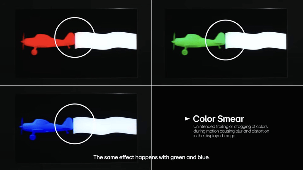紧接着LG点名的第二个大坑——“串色”。RGB背光每个分区自带颜色属性,如果分区尺寸不够细、控光算法跟不上,高对比画面的边缘就容易出现颜色溢出。这问题在RGB-Mini LED上特别明显,比如下方图中,红色、绿色以及蓝色飞机后面拖着的白色横幅,当色彩调光与白色调光重叠时,白色部分会被前方的色彩所染色,人眼一眼就能察觉。LG拿这点说事,确实打到了七寸。