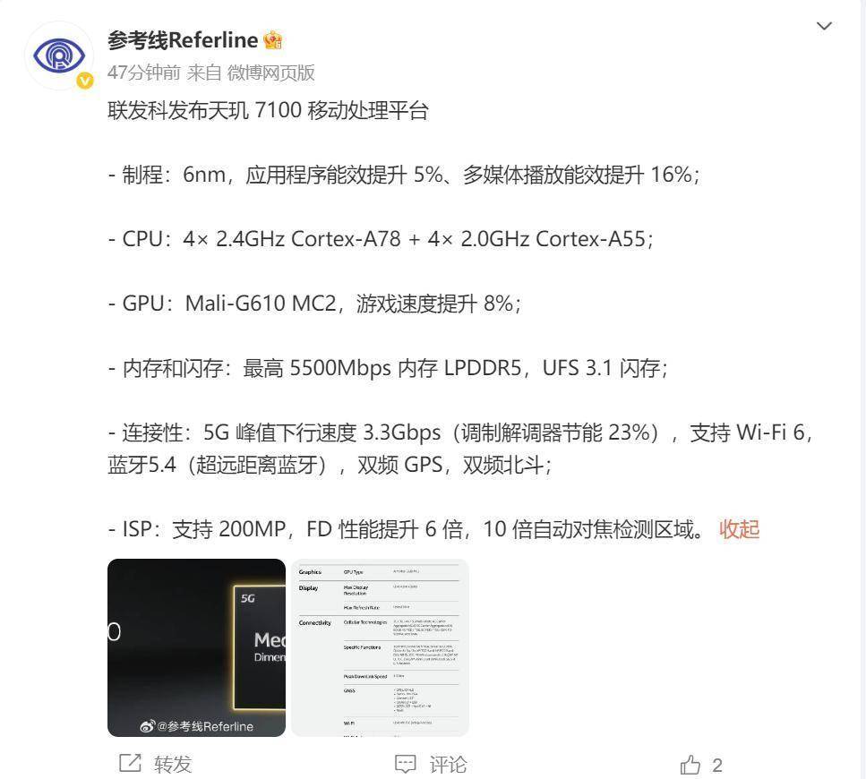 博主爆料称:联发科官方于2025年12月30日发布天玑7100移动处理平台,基于台积电6nm制程工艺,在能效比、影像和处理性能方面实现全面升级。