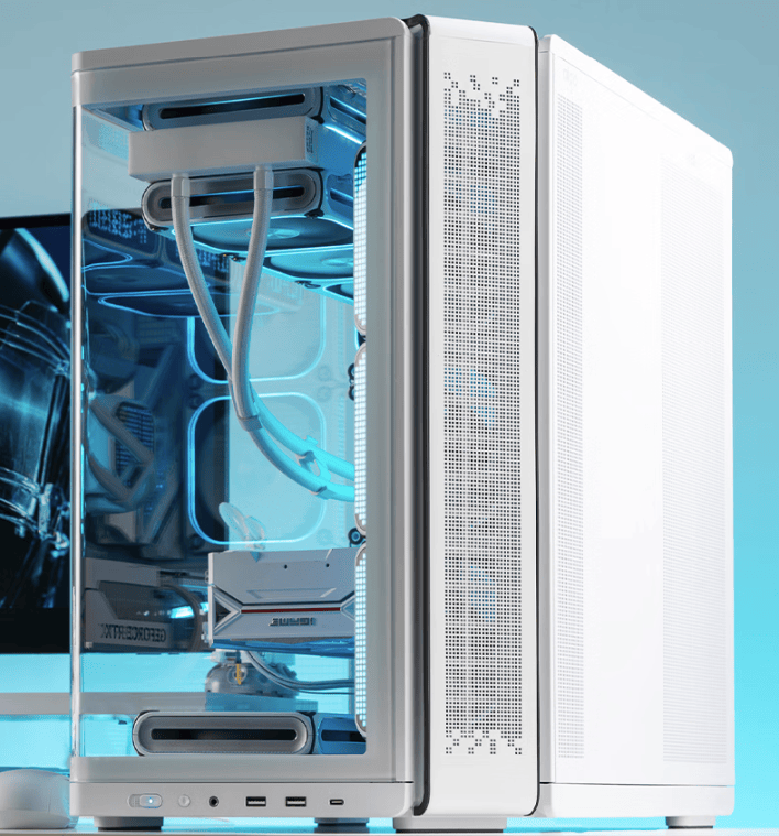 散热性能是该机箱的核心竞争力之一,彻底打破“海景房机箱=闷罐”的刻板印象。左右分仓设计实现冷热空气物理分离,避免热量循环堆积;顶部、前后面板均采用高密网孔,保障空气流通效率;靠前脸的3个斜吹风扇位,能精准将冷风导向CPU与显卡核心区域。实测显示,搭载6风扇+360水冷的装机方案,烤机时CPU最高温度仅87℃,显卡温度低至65℃,即使运行《『赛博朋克』2077》等大型游戏,硬件温度也能稳定在安全区间。