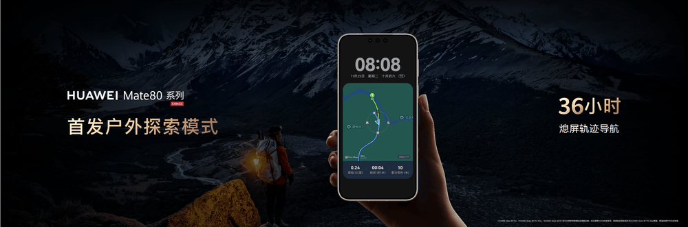 长距离户外穿越,续航保障是决定探索体验的关键。基于华为软硬芯云一体化能力,华为Mate80系列兼顾导航便捷性与设备续航,提高户外场景下的续航表现。用户开启“户外探索模式”后,可实现长达36小时轨迹导航——熄屏状态下还能清晰显示规划路线、实际行走轨迹、耗时及爬升高度等核心数据,让用户专注行进探索。若在户外长时间使用担心电量紧张,用户还可开启“极限续航模式”,可实现最长14天的超长待机、期间仍支持全天候轨迹记录、28分钟卫星通话、 14次摩斯码手电筒等应急功能,无论是短途探索旅途,还是长途的荒野徒步、露营,都能提供持久可靠的续航支持,让用户尽兴探索。