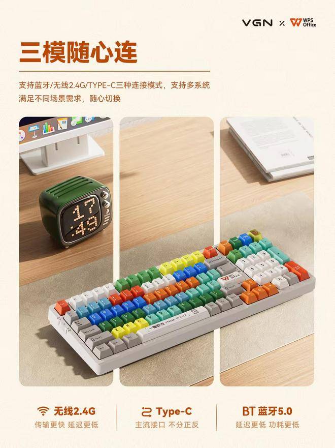 12 月 31 日消息,VGN 今日正式推出了 V98Pro V3 三模机械键盘的 WPS 联名版本,首发价 389 元并附赠三颗 "W" "P" "S" 经典主题色联名增补键帽和对应增补轴体。