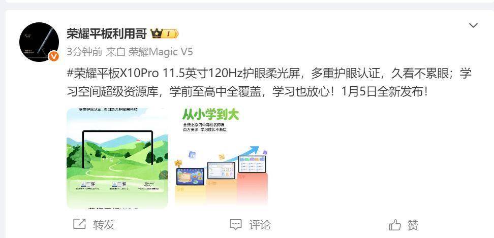 博主荣耀平板利用哥 透露,荣耀平板X10 Pro将于1月5日正式亮相,配备11.5英寸护眼柔光屏与学习空间超级资源库,覆盖学前至高中全年龄段学习需求。