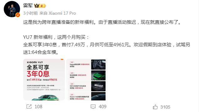 1月1日,雷军在微博发文称:“这是我为跨年直播准备的新年福利。由于直播活动推迟,现在就直接公布了。YU7新年福利,这两个月购买:全系可享3年0息,首付7.49万元,月供可低至4961元。欢迎假期到店体验,试驾另送1:64合金车模。”