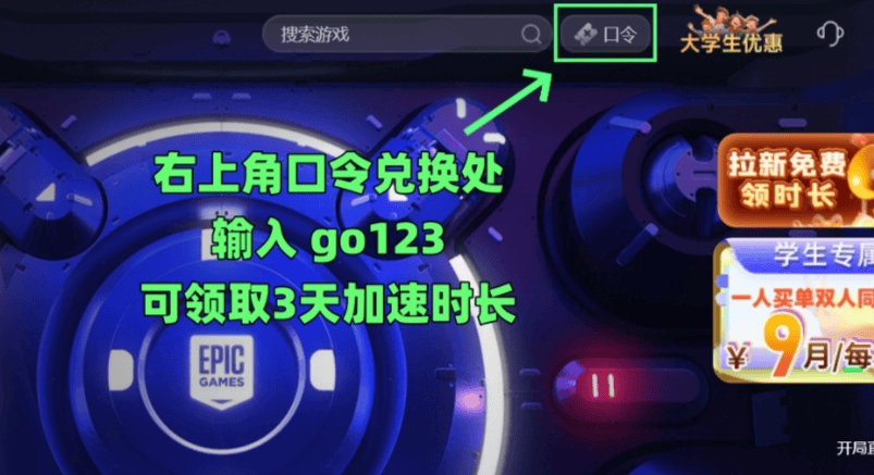 右上角口令兑换处输入【go123】可领取3天加速时长