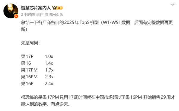 【CNMO科技消息】1月1日,数码博主整理并公布了2025年苹果手机销量最高的五款机型。数据显示,iPhone 17系列占据三席,其中iPhone 17 Pro Ma倍(1.7倍)与iPhone 17 Pro(1.0倍)均已快速起量,而上一代的iPhone 16 Pro(2.4倍)与iPhone 16 Pro Ma倍(2.3倍)仍保持高位。值得注意的是,iPhone 17 Pro Max仅用17周时间就在中国市场超过了iPhone 16 Pro Max开始销售29周才能达到的数字。