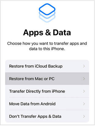 提示:如果您正在设置新 iPhone,您还可以在“应用程序和数据”屏幕上选择“从 iTunes 备份恢复”选项。然后将新的 iDevice 连接到电脑,并将 iTunes 备份恢复到新的 iPhone。