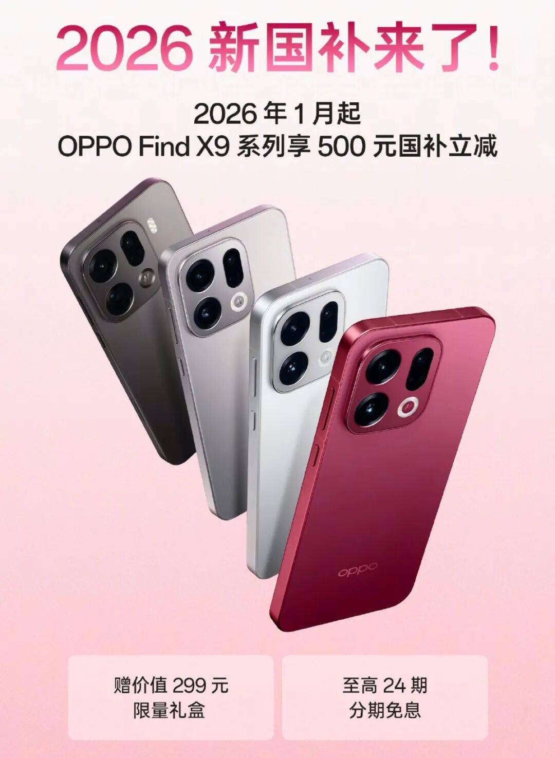 昨日,OPPO Reno15系列的“星星粉”新配色刚刚开售,今天OPPO又宣布了一则重磅消息:2026年新一轮“新国补”正式启动。从1月1日起,购买OPPO Find X9系列即可享受10%的国家补贴,最高立减500元,无疑为新年换机用户带来了实实在在的福利。