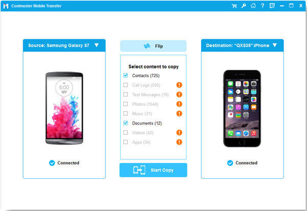 第 3 步:将数据从 Android 手机传输到 iPhone。在传输数据之前,请确保将您的 Android 设备设置为“源”设备,并将您的 iPhone 设置为“目标”设备。如果设备设置不正确,请单击“翻转”按钮重新排列它们。选择并预览要发送的内容,然后单击“开始复制”按钮开始传输。