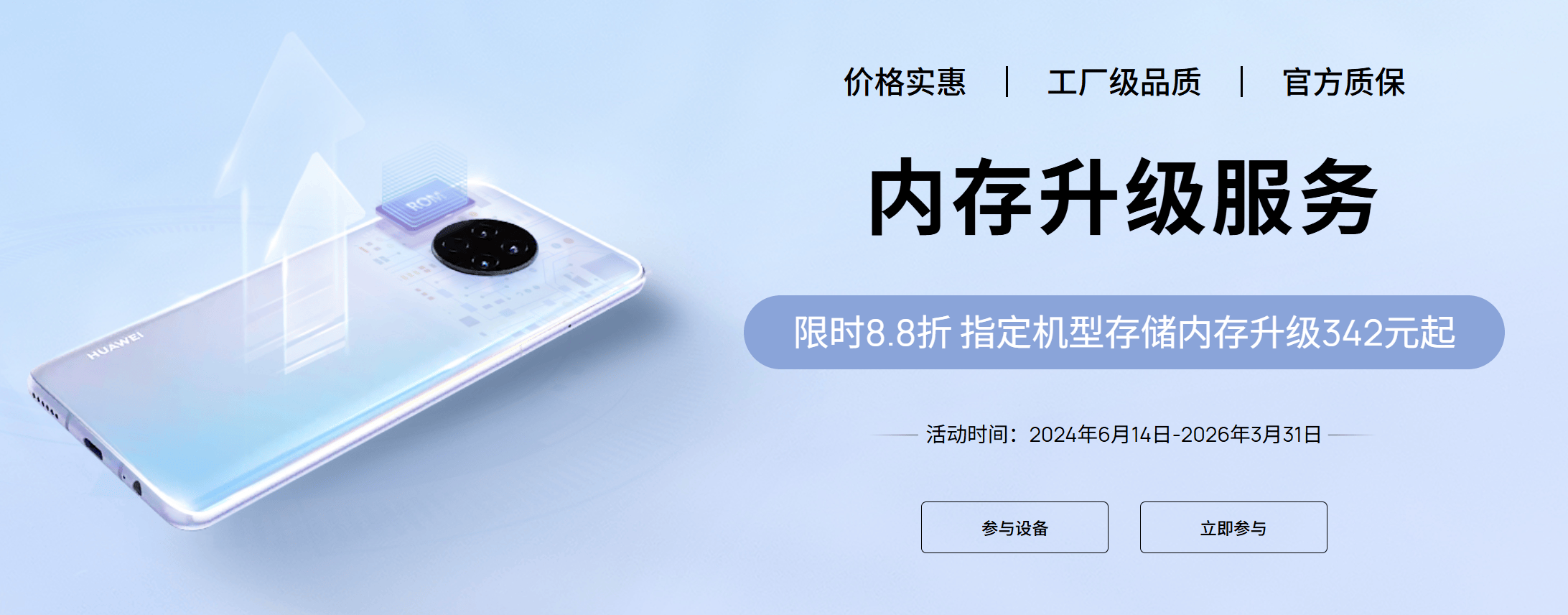 对于老款机型储存空间不够的问题,华为还有官方的扩容服务,限时8.8折、低至342元起,机身储存可扩容至128GB、256GB或512GB,这项服务更能让老款手机“再战三年”。