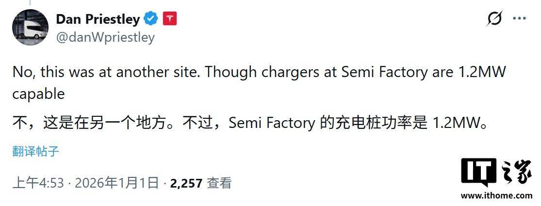 1 月 1 日消息,特斯拉 Semi 官方 X 账号昨日(2025 年 12 月 31 日)发布推文,分享了一段视频,展示了 Semi 电动卡车在 Megacharger 充电站的实测表现,其持续充电功率达到惊人的 1.2 兆瓦(MW)。