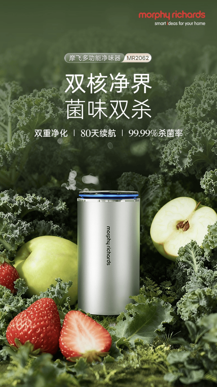 告别传统净味产品的“掩盖式除味”,摩飞多功能净味器从根源瓦解异味分子:活性氧强效氧化分解冰箱串味、车内烟味、卫浴霉味等异味源头,不留下任何残留;负离子主动捕捉空气中的异味颗粒,中和沉降后让空间回归清新。无论是冰箱里的“百味混杂”,还是鞋柜、卫浴的闷湿异味,都能快速净化,不留尴尬。