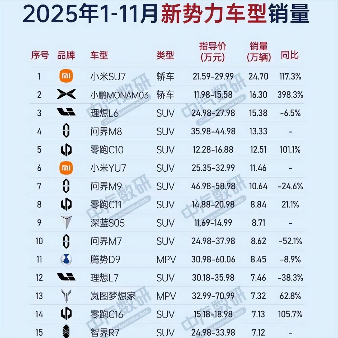 而从7月份到12月份,YU7今年仅卖了6个月,全年销量可能达到15万左右,很可能会进入新势力车型的前五名,可能会排在第四、或第五的位置。