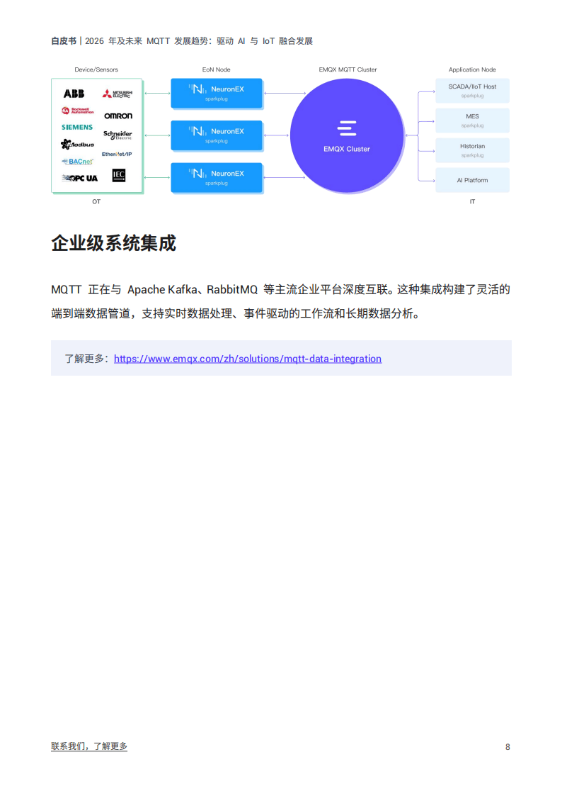 部署与生态整合呈现轻量化、一体化趋势。Serverless MQTT凭借弹性伸缩特性,降低了用户部署与运维成本,适配不同规模的IoT应用需求。集群互联技术则打破了MQTT集群的地域限制,提升了系统的扩展性与可靠性。在OT/IT融合背景下,MQTT作为统一通信协议,成功对接Apache Kafka、RabbitMQ等主流中间件,同时兼容BACnet、Modbus、OPC UA等工业协议,实现了设备、传感器、AI平台与应用系统的无缝联通,构建起跨场景的数据互通生态。