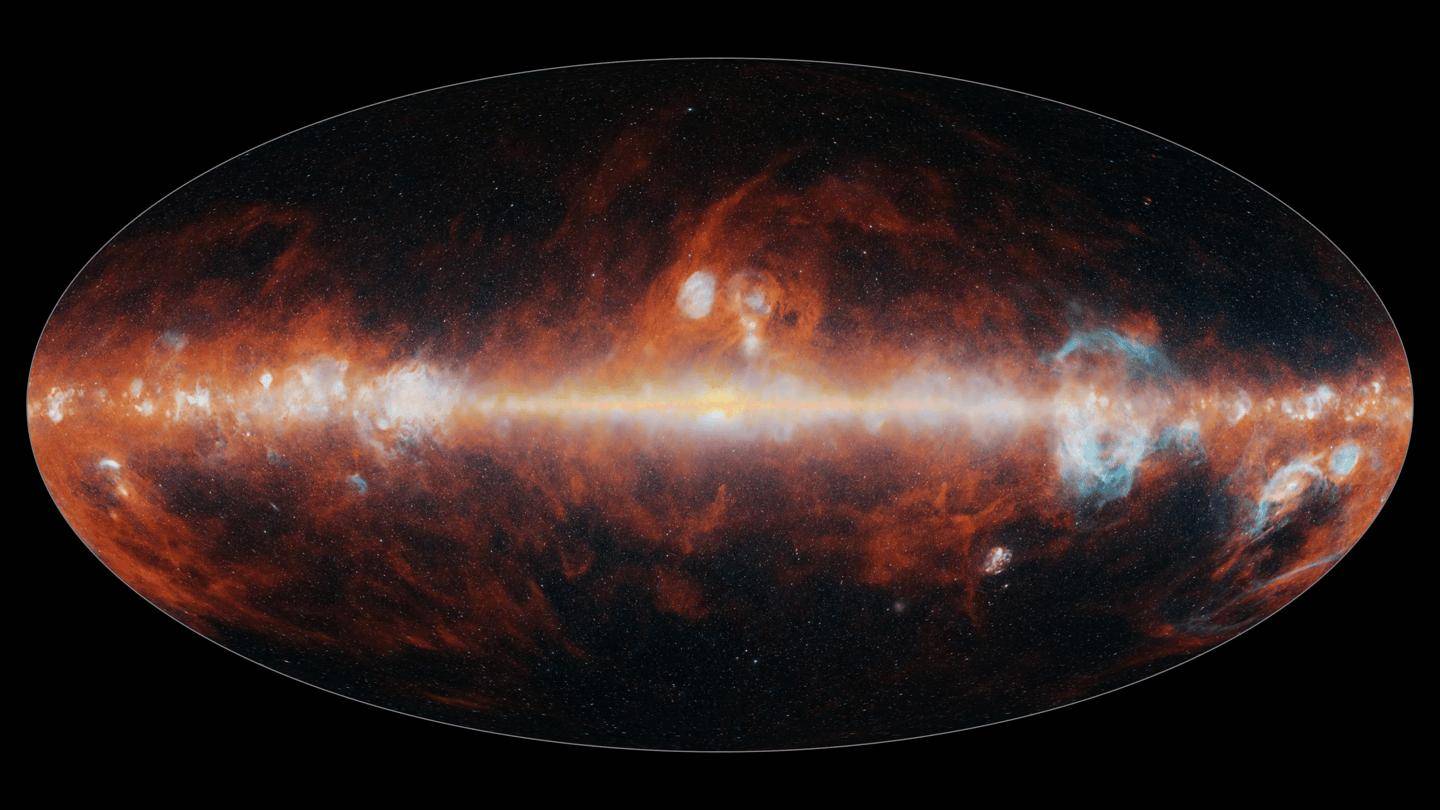 美国宇航局的 SPHEREx 探测器已经绘制了整个天空的 102 种红外颜色图。这些颜色肉眼不可见,但可以用来揭示宇宙的不同特征。这张图像展示了主要由恒星(蓝色、绿色和白色)、高温氢气(蓝色)和宇宙尘埃(红色)发出的部分颜色。图源:美国宇航局