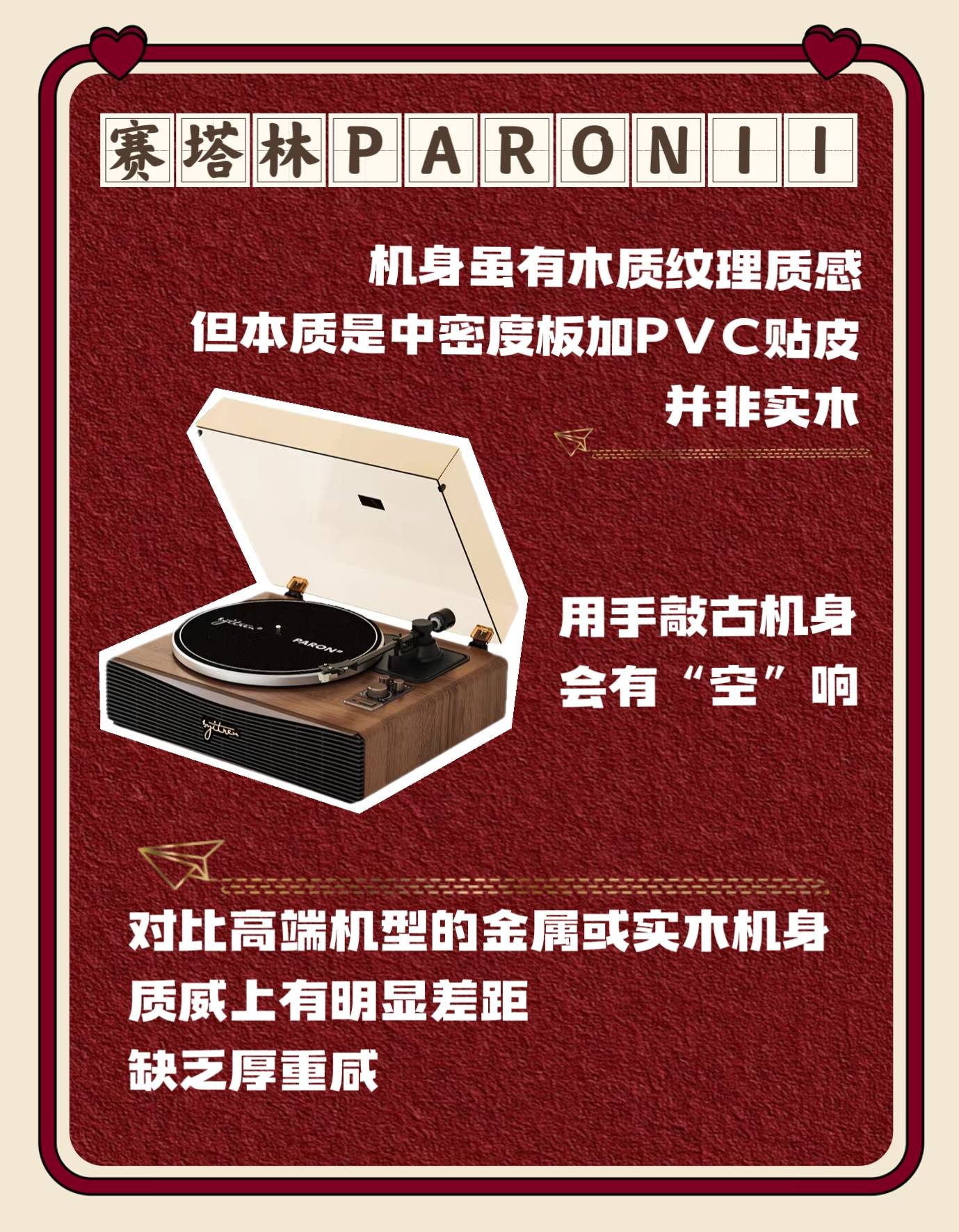 赛塔林 PARON II:作为入门级黑胶机,虽配置全面、性价比尚可。这款机型虽自带 4 个 HiFi 音响单元,但受机身腔体和尺寸限制,音响系统显得比较单薄。实际播放时声音整体偏糊,播放高音时还可能出现共振问题。而且它的音质对唱片比较挑剔,不同材质、录制水准的唱片播放效果差异大,不像高端机型能稳定还原各类曲风细节,对于追求音质纯净度的用户来说,大概率需要额外外接音箱才能改善体验