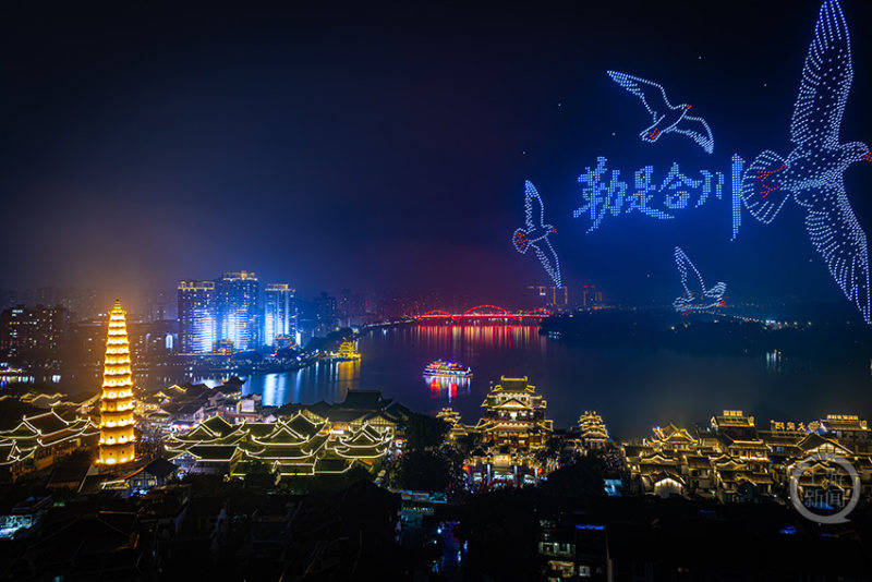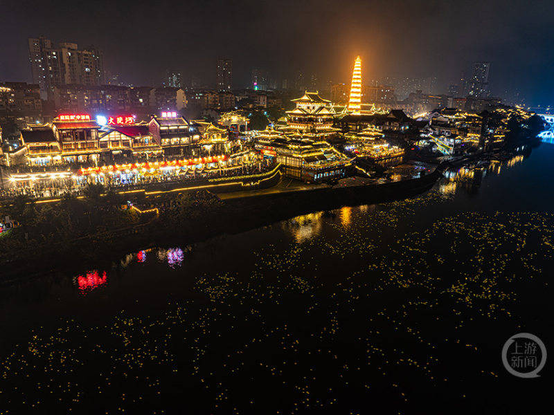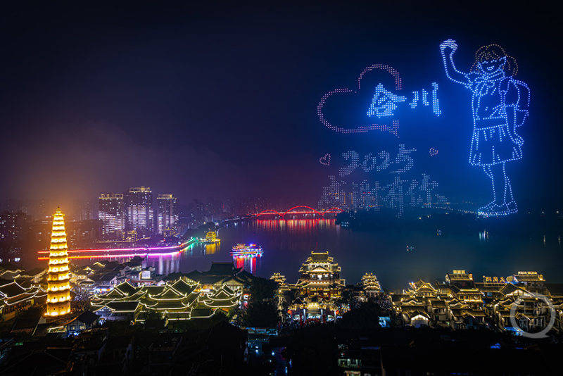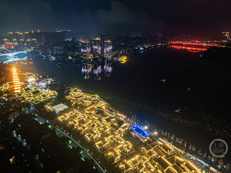 天上,无人机编队以苍穹为幕,描绘出流动的光影画卷;江中,万千盏河灯点亮“祝福航道”,谱写出优美的心愿诗篇。