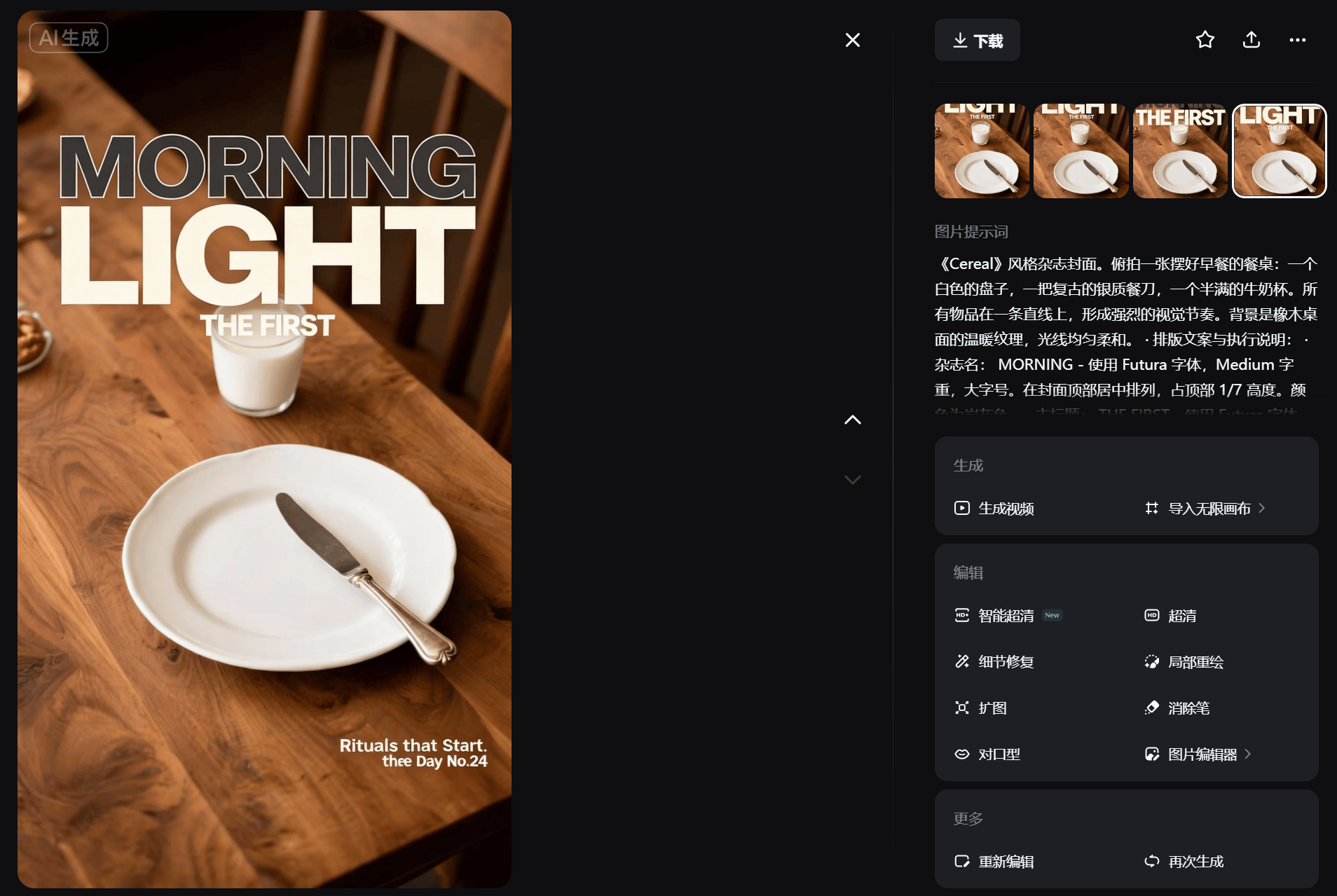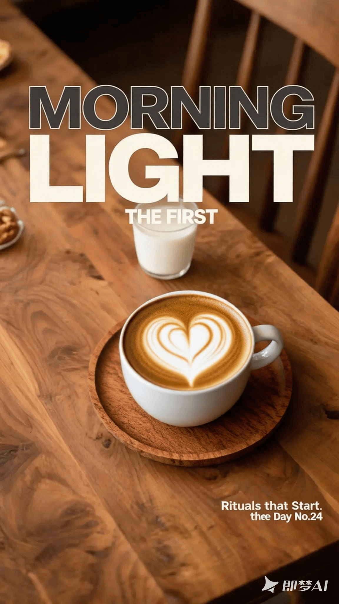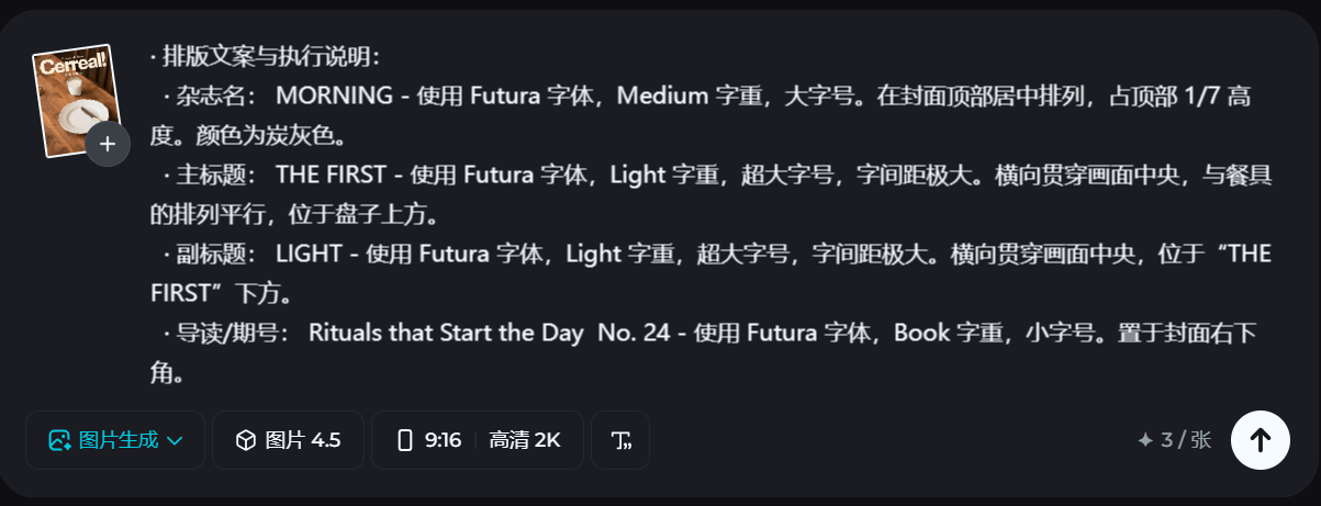 “ 《Cereal》风格杂志封面。俯拍一张摆好早餐的餐桌:一个白色的盘子,一把复古的银质餐刀,一个半满的牛奶杯。所有物品在一条直线上,形成强烈的视觉节奏。背景是橡木桌面的温暖纹理,光线均匀柔和。 · 排版文案与执行说明: · 杂志名: MORNING - 使用 Futura 字体,Medium 字重,大字号。在封面顶部居中排列,占顶部 1/7 高度。颜色为炭灰色。 · 主标题: THE FIRST - 使用 Futura 字体,Light 字重,超大字号,字间距极大。横向贯穿画面中央,与餐具的排列平行,位于盘子上方。 · 副标题: LIGHT - 使用 Futura 字体,Light 字重,超大字号,字间距极大。横向贯穿画面中央,位于“THE FIRST”下方。 · 导读/期号: Rituals that Start the Day No. 24 - 使用 Futura 字体,Book 字重,小字号。置于封面右下角。 ”
