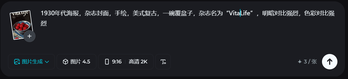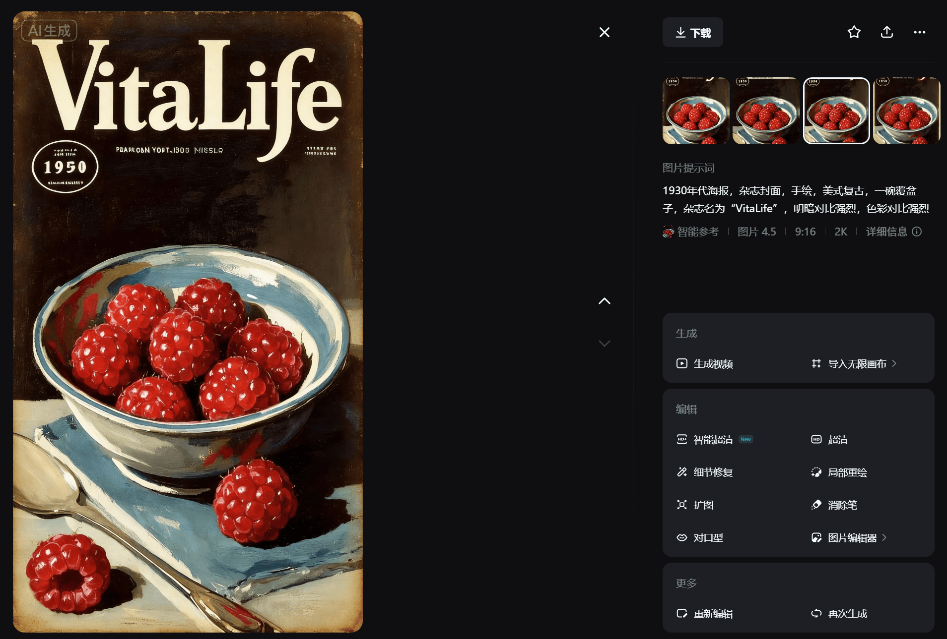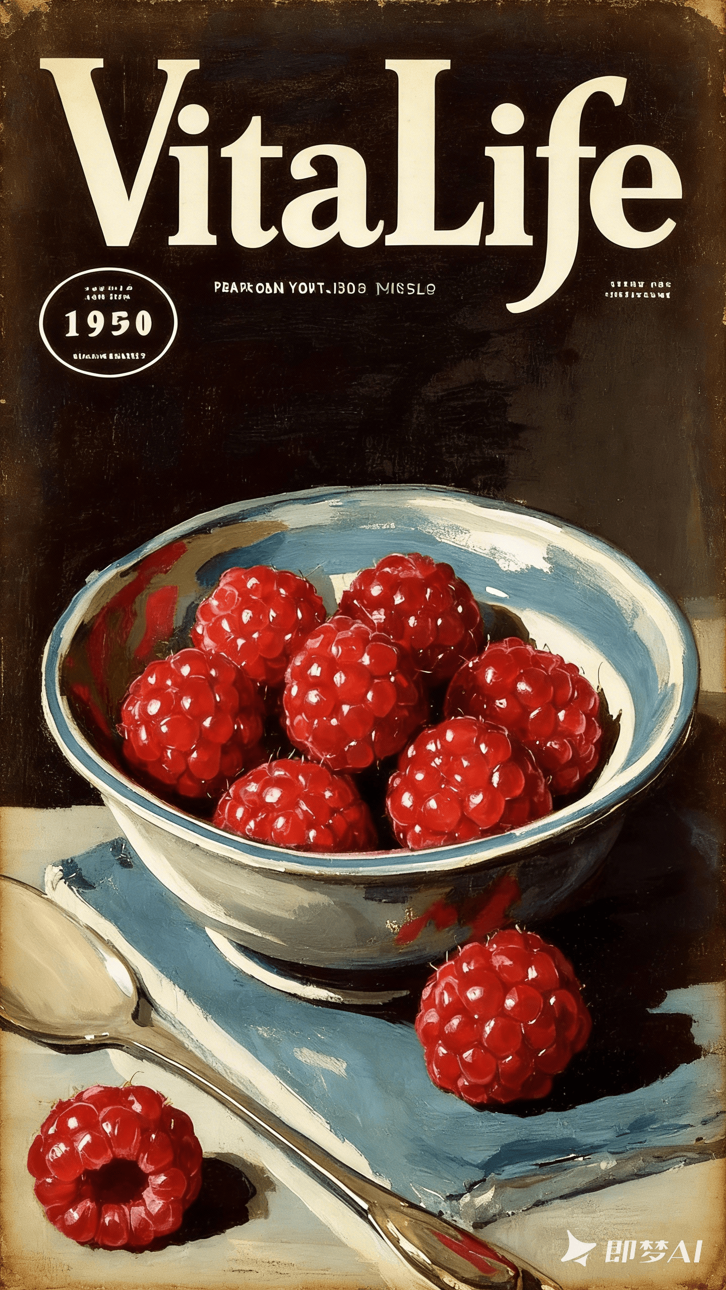 “1930年代海报,杂志封面,手绘,美式复古,一碗覆盆子,杂志名为“VitaLife”,明暗对比强烈,色彩对比强烈”