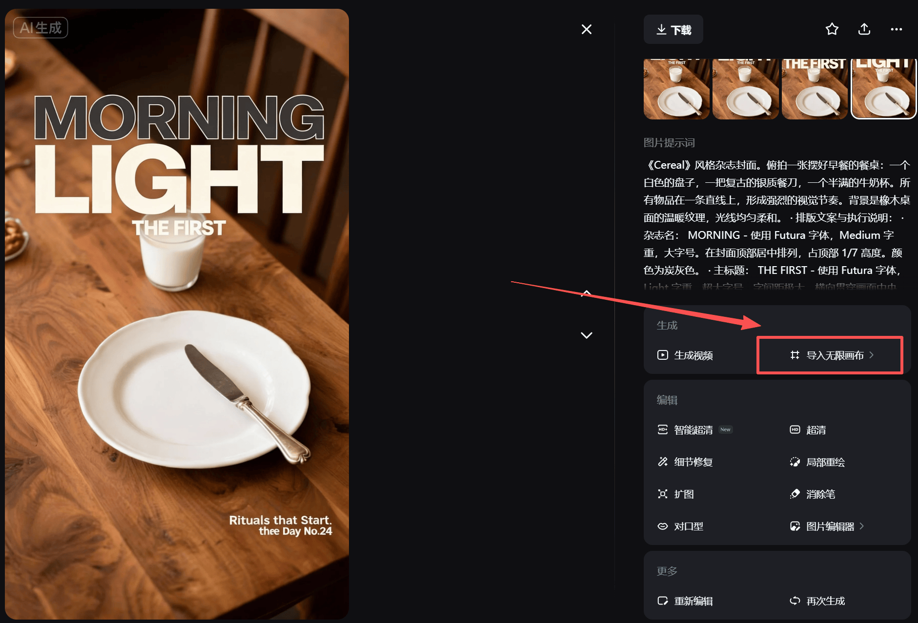 这一步的价值在于: 你不用重新生成,也不需要担心风格跑掉—— 同一张KV可以稳定衍生出整套物料。