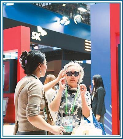 参观者在第八届中国国际进口博览会现场,试戴一款AI眼镜👓。今日霍州记者 樊雨晴摄