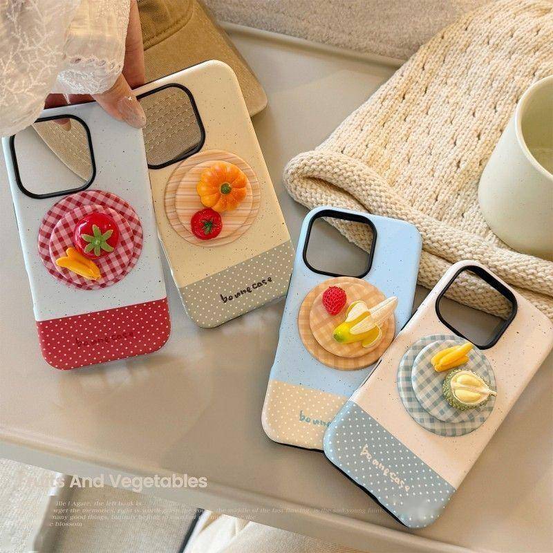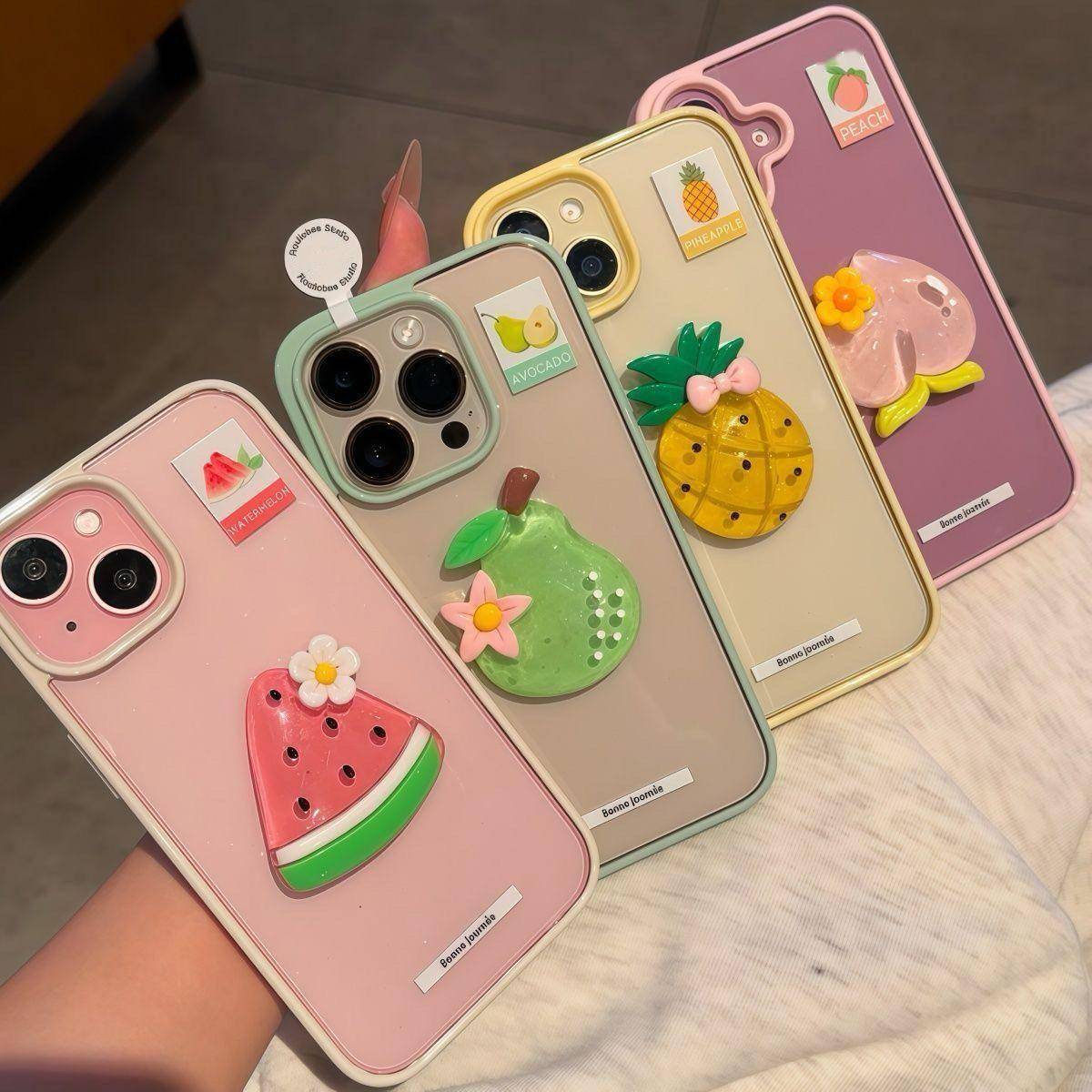内置强磁铁,可以兼容市面上大多数磁吸支架和车载支架。立体水果图案与实用功能的结合,特别适合经常需要将手机立在桌面上使用的办公族。