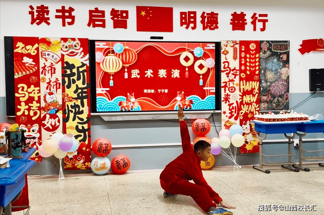 联欢会伊始,校长武立荣为滨河学子送来了新年祝福,希望在新的一年里勤学善思、锤炼本领,将个人志向融入时代发展,争做有理想、敢担当、能吃苦、肯奋斗的新时代好少年。随后,属于各班的元旦联欢会正式拉开帷幕。教室里张灯结彩,处处洋溢着浓郁的节日氛围。有的班级带来晋剧选段演唱,婉转的唱腔、优美的身段,尽显传统戏曲的独特韵味,台下同学跟着节奏轻轻哼唱;有的班级开展“晋地名人故事会”,同学们声情并茂地讲述司马光砸缸、王维诗画传情的故事,现场掌声此起彼伏。除了精彩的文艺表演,还有的班设置了趣味十足的互动环节,将晋文化知识融入其中。同学们不仅感受到了节日的快乐,也进一步感受了三晋文化的底蕴。