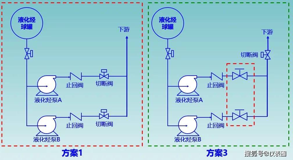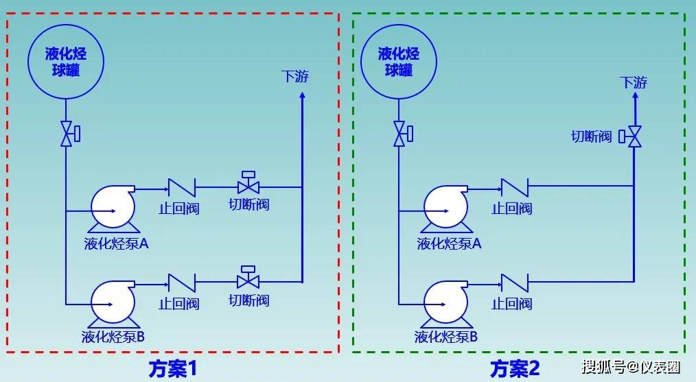 关于两台泵(一用一备)的止回阀和切断阀的配置方案,业界有两种不用的声音,我把两种不用的方案画成示意图如下: