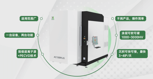 作为专注真空镀膜表面处理的企业,华升纳米类金刚石复合涂层机AC1500PLUS,核心优势在于“复合技术+灵活适配”。它创新性融合了阳极层离子源与PECVD两大主流DLC技术,充分利用阳极层离子源技术的便捷性(装载方便、大小可混装)和PECVD技术高硬度、高效率特点。产品混装时用阳极层离子源;单一产品量大时用PECVD。硬度可在1000~3000HV之间灵活调控,软涂层能适配精密电子部件,硬涂层可满足工程机械耐磨需求。而且沉积效率快,最快能实现3~4炉/天,同时涂层厚度控制在2~4μm,完全符合高端制造的精度要求。