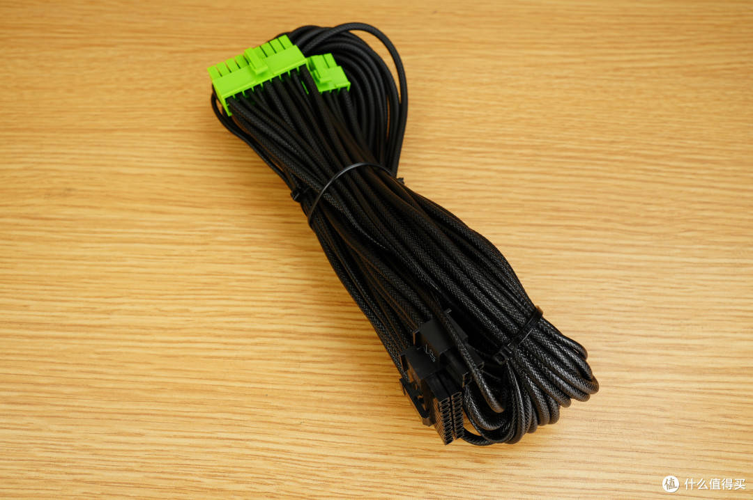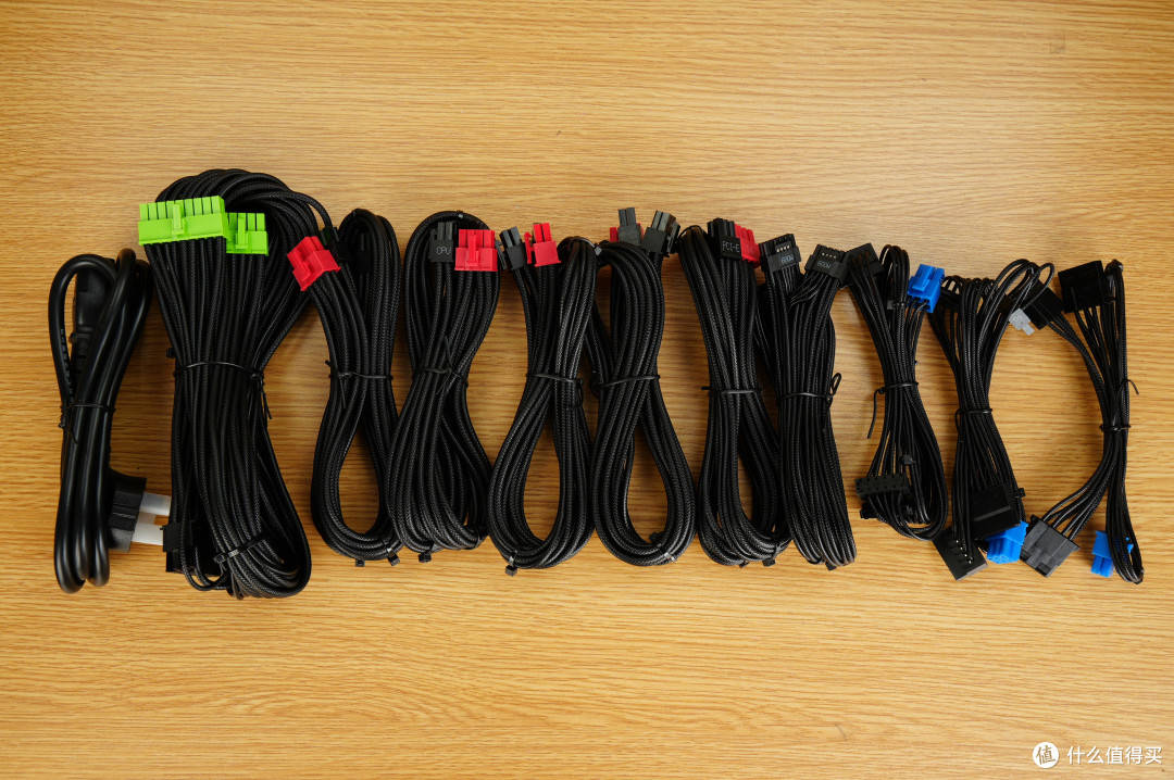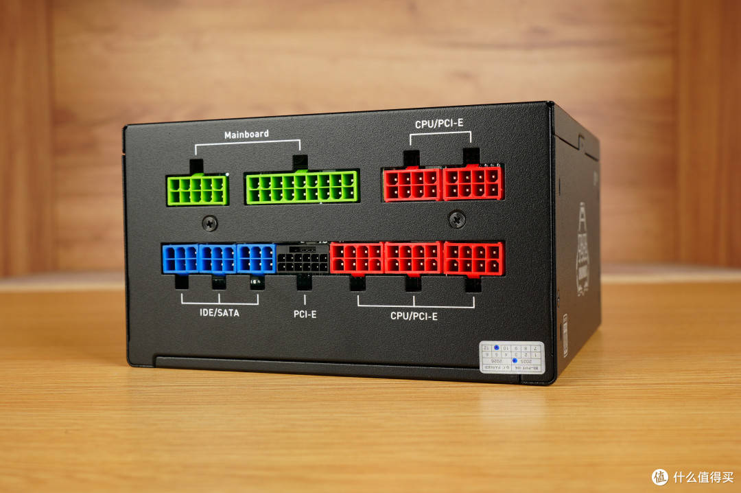 电源为全模组接口设计,并且采用了全新的接口颜色管理,不同类型的接口均用了不同的颜色进行区分,比如蓝色的SATA供电接口、绿色的主板24PIN接口、白色的12VHPWR接口以及红色的CPU、显卡电源接口。
